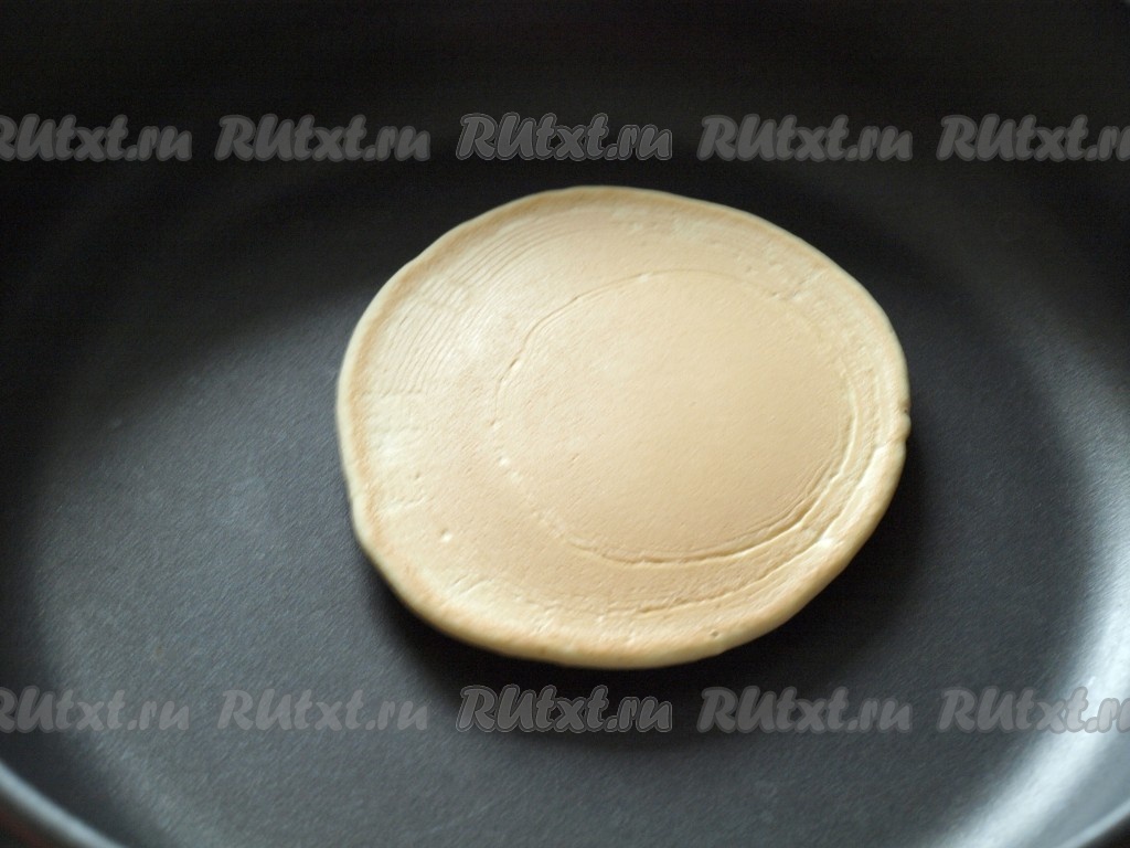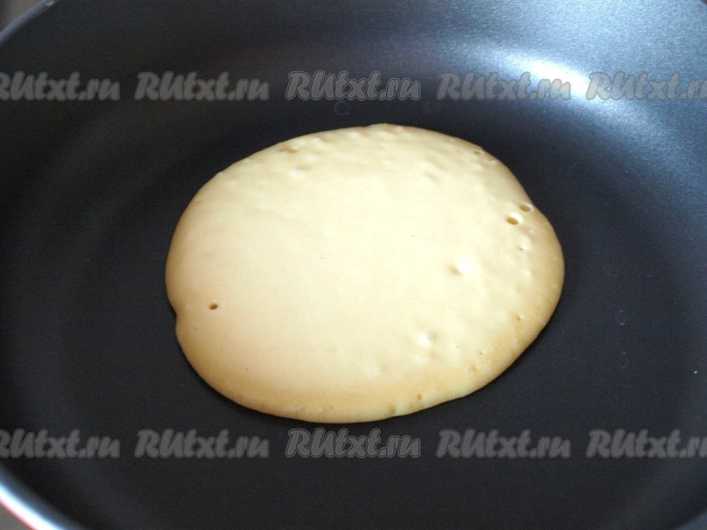 В центр хорошо разогретой сухой сковороды наливать по 3 столовые ложки теста. Дождаться, пока вся поверхность панкейка затянется, затем перевернуть.