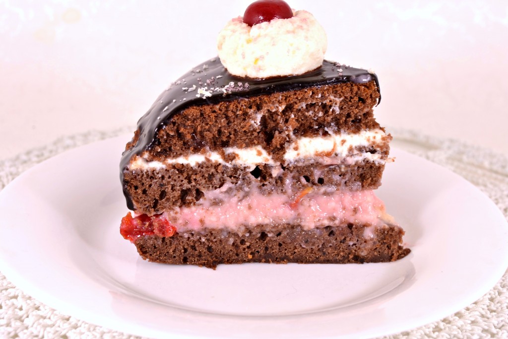 Далее необычайно вкусный, нежный, очень ароматный шоколадно-вишнёвый торт со сметанным кремом нарезать на части и подать к столу. У меня на фото прослойка из сметаны ещё не совсем застыла, не было времени, пришлось разрезать, но это никак не повлияло на вкус торта.