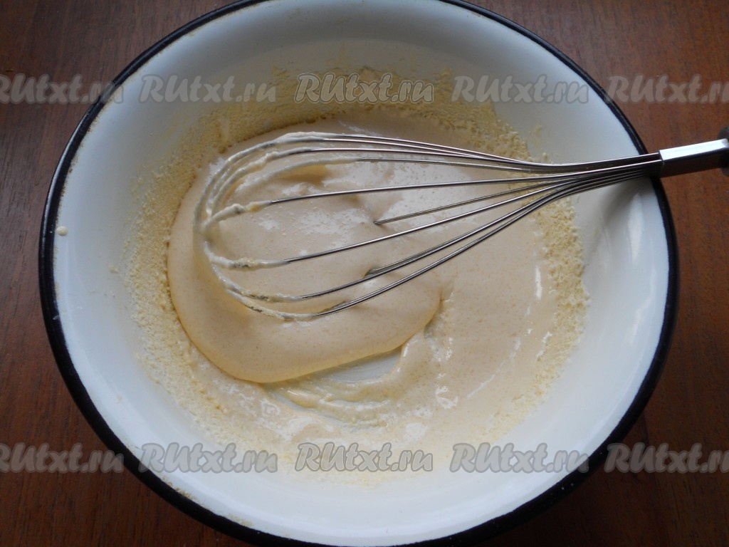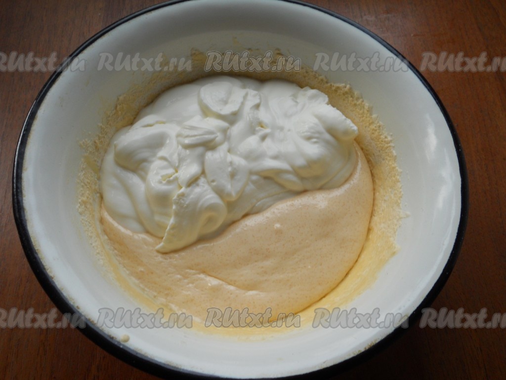 В яичную заварную смесь добавить желатин, перемешать и добавить сметану.