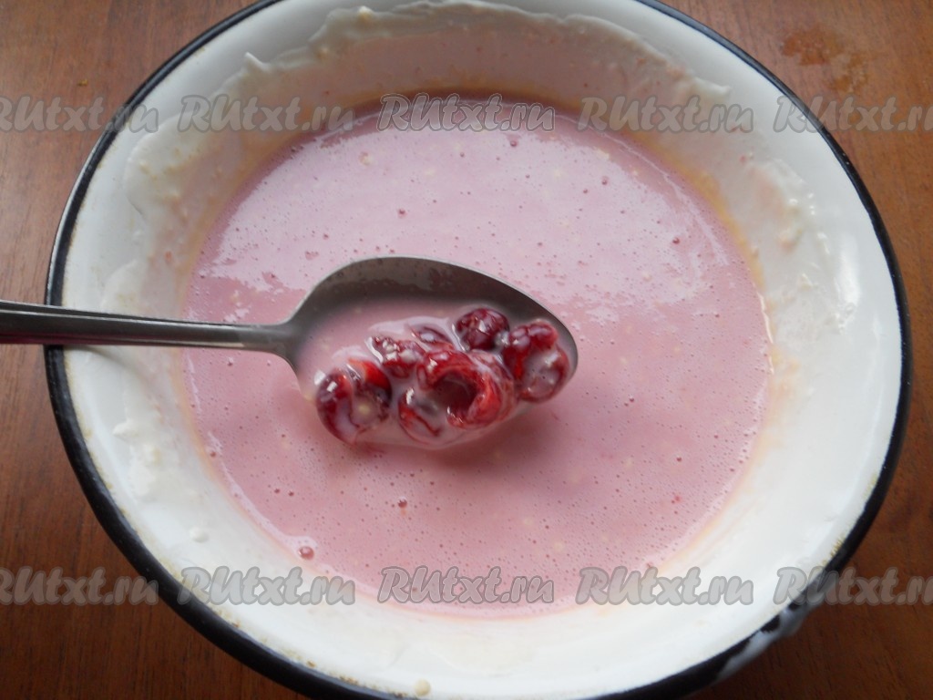 Перемешать венчиком получившуюся сметанную массу и добавить вишню вместе с сиропом. Тщательно перемешать. Смесь будет жидковата, поэтому поместить ее в холодильник на 15-20 минут, чтобы немного загустела.