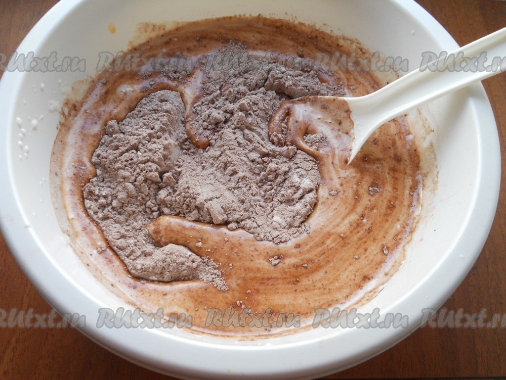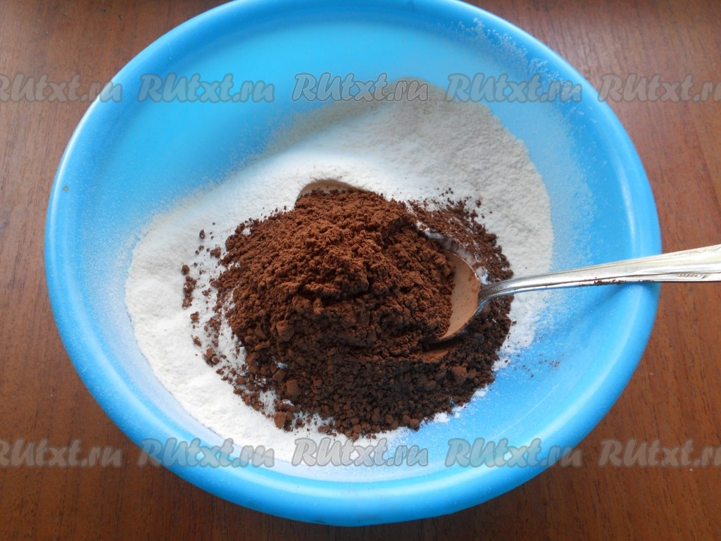 Соединить муку, какао-порошок и разрыхлитель, перемешать получившуюся мучную смесь.