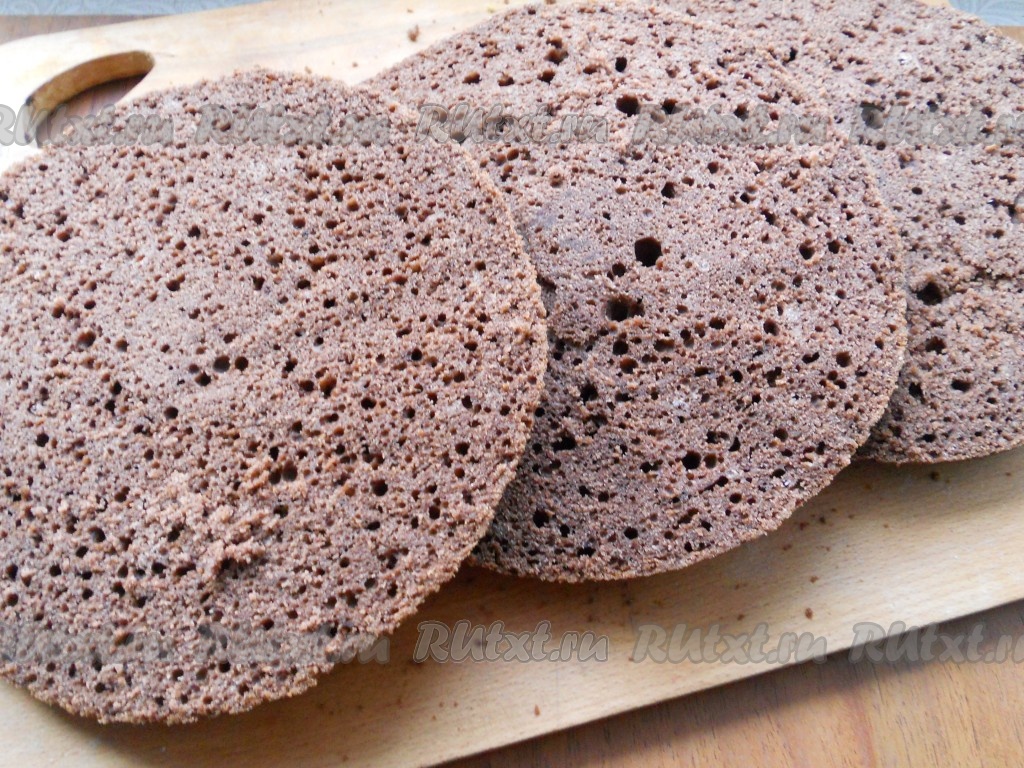 Бисквит разрезать на 3 коржа.