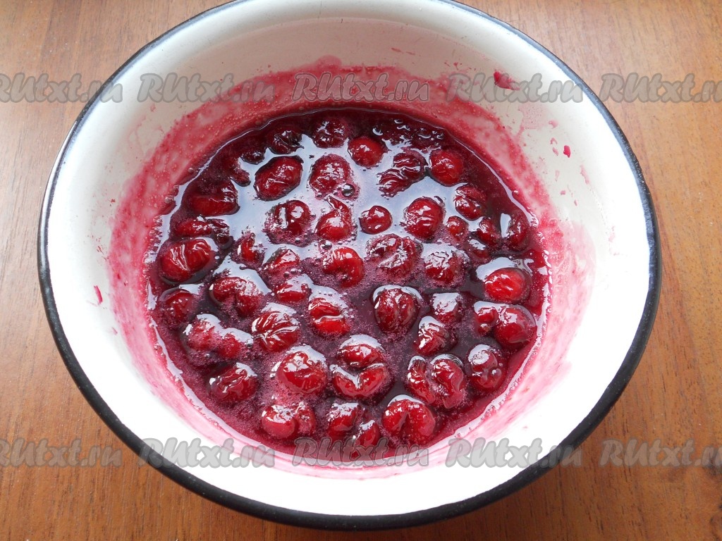 Для приготовления сметанной прослойки вишню разморозить (если замороженная), всыпать 50 грамм сахара, перемешать и оставить на 30 минут. Затем поставить ёмкость с вишней на огонь, варить на медленном огне около 15 минут. Вишню остудить.