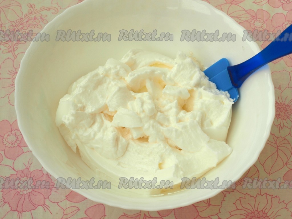 В отдельной миске взбить охлаждённые белки и оставшиеся 50 грамм сахара до пышной пены.