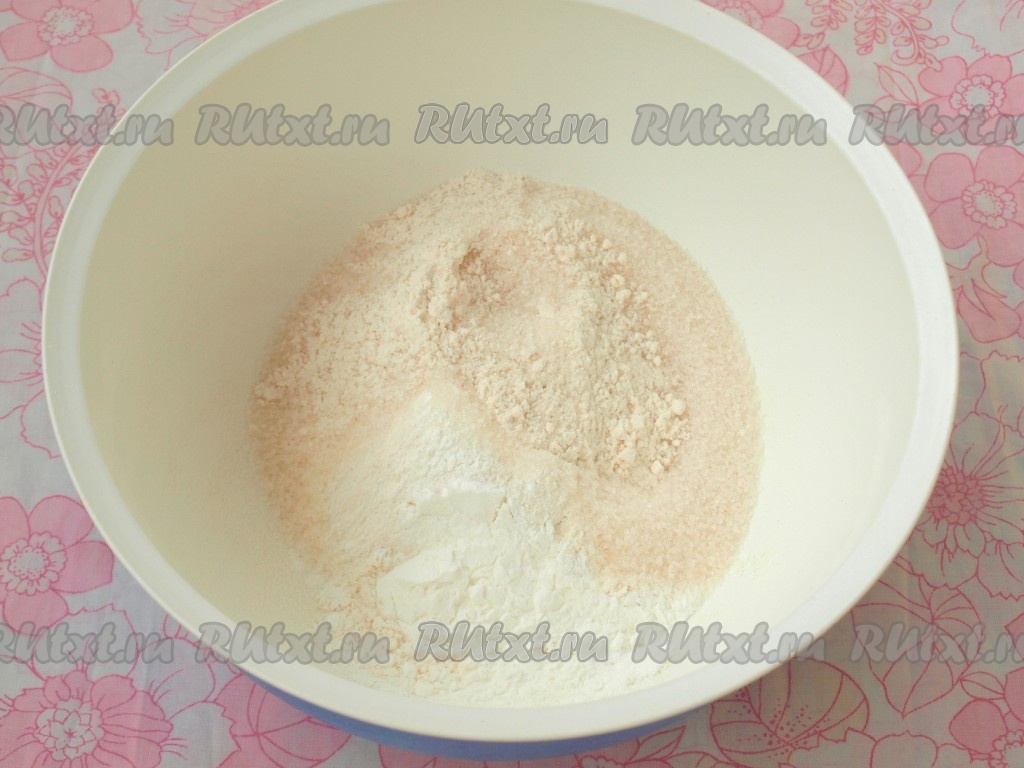 Смешать муку, 200 грамм сахара, крахмал и разрыхлитель.