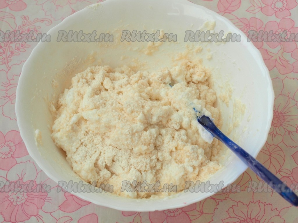Мучную смесь вводить частями во взбитые белки, перемешивая аккуратно лопаткой по принципу бисквита - методом складывания.