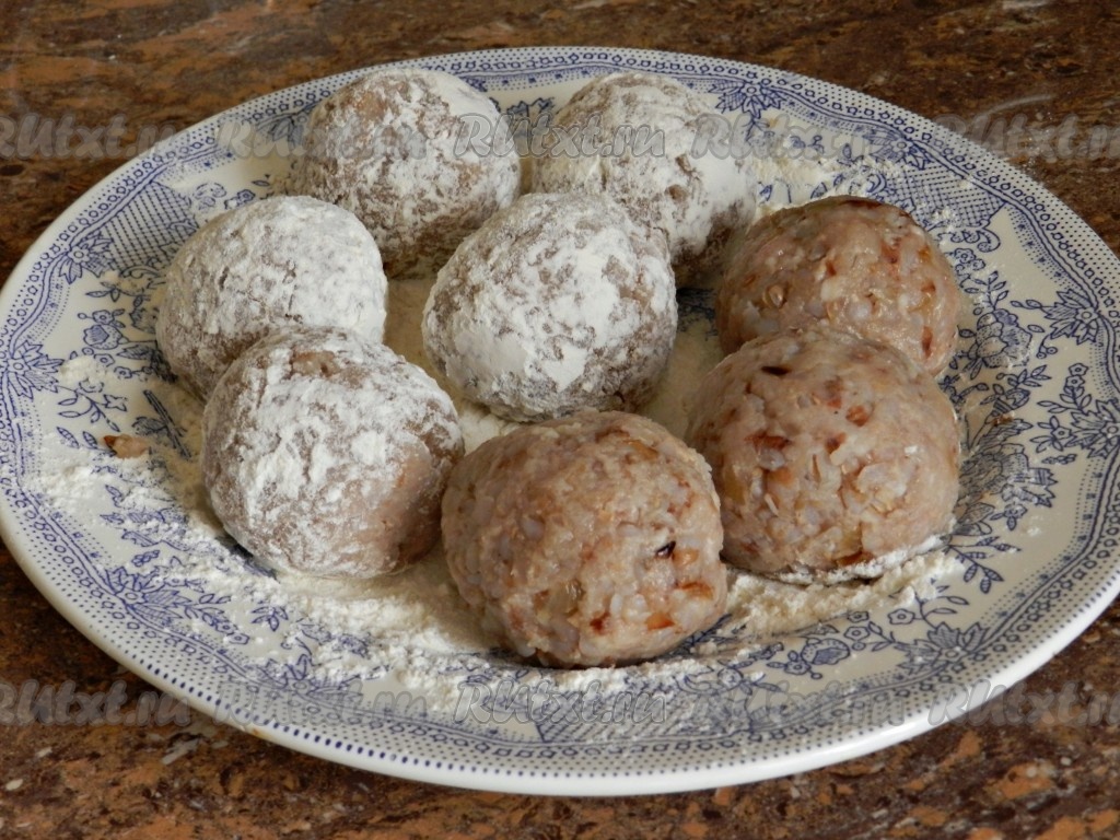 Из получившегося фарша сформировать небольшие тефтели (я сформировала 13 штук). Обвалять тефтели со всех сторон в муке.