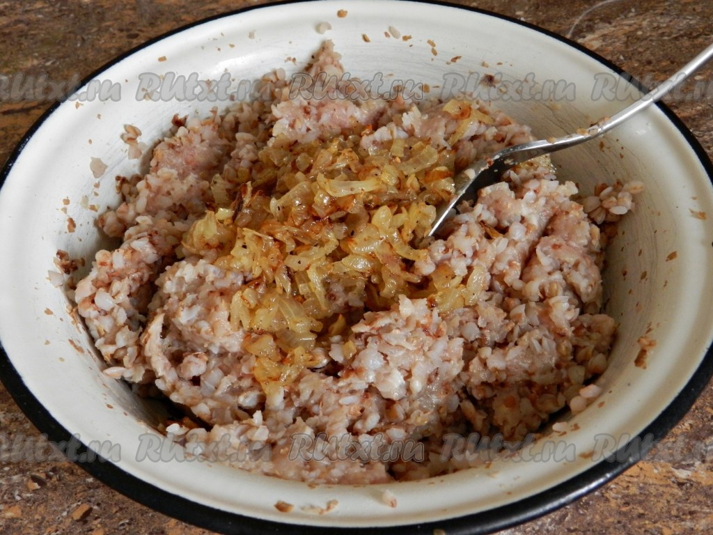 Луковицу очистить, нарезать кубиками и обжарить на растительном масле до золотистого цвета (в течение 4-5 минут), периодически перемешивая, на среднем огне, дать остыть. Остывший лук выложить к фаршу с гречкой, посолить, поперчить, хорошо перемешать, чтобы фарш для тефтелей стал однородным. Если вы не хотите добавлять жареный лук, добавьте сырой, пропустив его через мясорубку вместе с мясом.