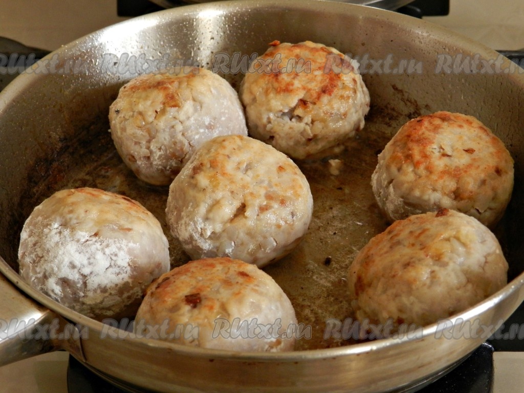 В сковороде разогреть растительное масло и выложить тефтели. Обжарить на среднем огне до лёгкого золотистого цвета с двух сторон.