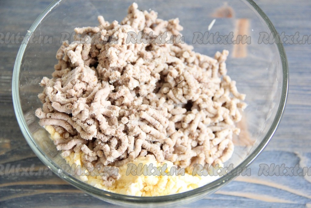 Пропустить через мясорубку яйца и размягченное сливочное масло.