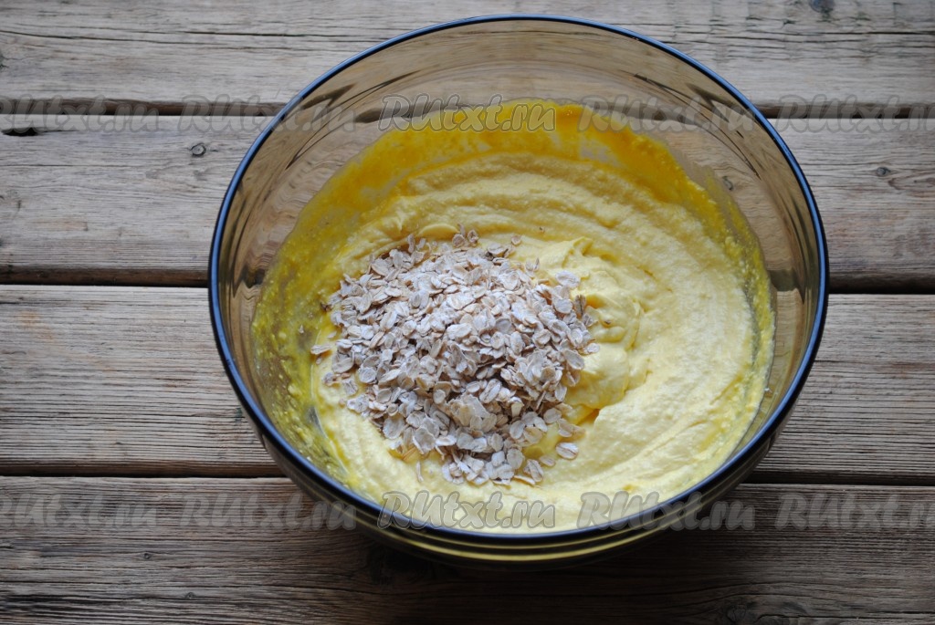 Всыпать овсяные хлопья в творожную массу, перемешать и дать постоять минут 10, чтобы хлопья набухли.