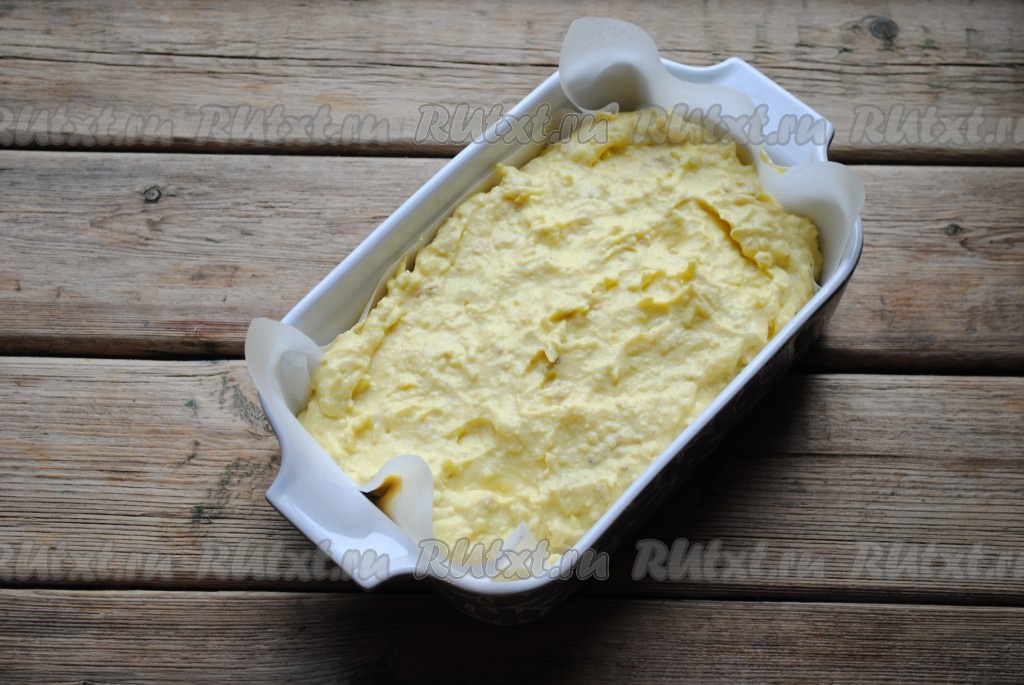 Жаропрочную форму застелить пергаментом и заполнить получившейся творожно-овсяной смесью.