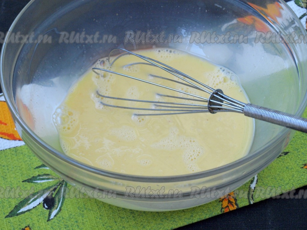 В миске взбить венчиком яйца, затем добавить соль и молоко, ещё раз хорошо перемешать.