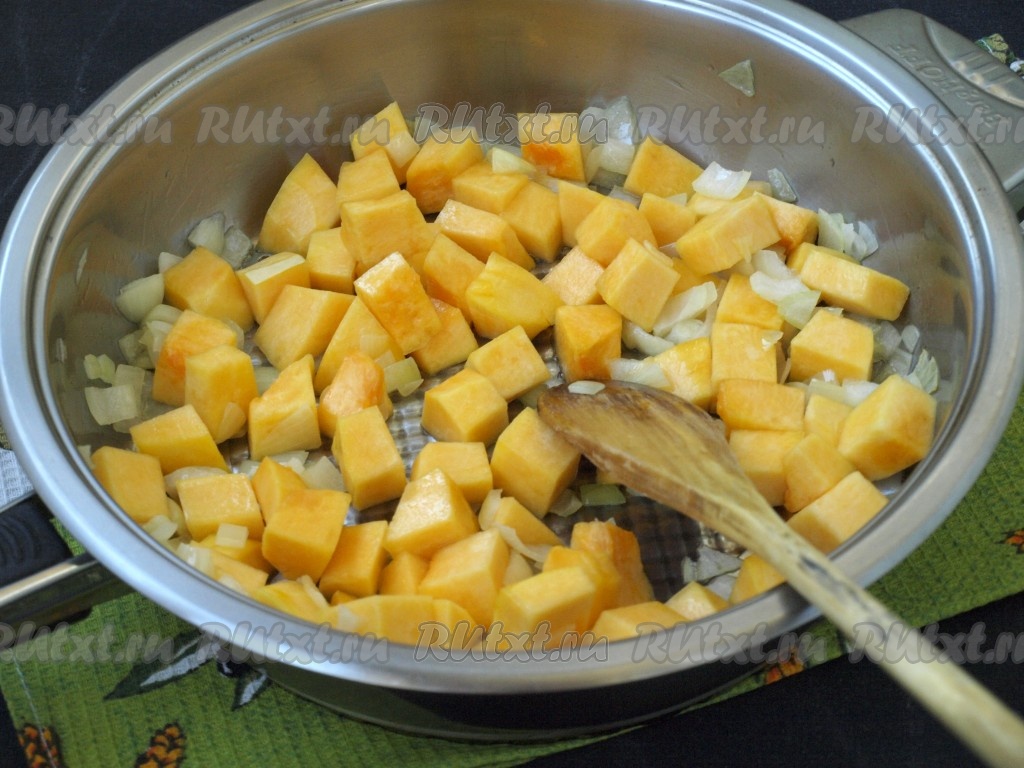 В сковороде разогреть подсолнечное масло, выложить мелко нарезанный лук и обжарить, иногда помешивая, до прозрачности. Добавить в сковороду тыкву, убавить огонь и готовить под крышкой 15 минут, периодически перемешивая.