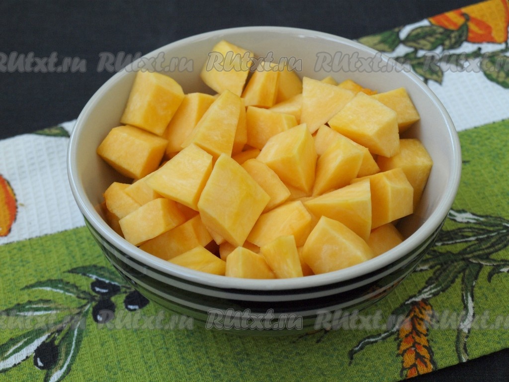 Тыкву, очищенную от кожуры и семечек, нарезать небольшими кубиками.