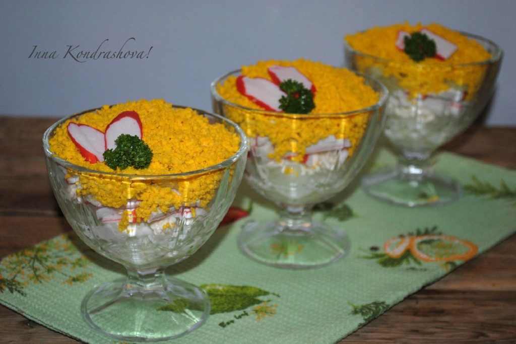 Не за горами Новый год и я начала экспериментировать с салатами. Рецепт этого салата с крабовыми палочками, яблоком и яйцами прочла в журнале и взяла себе на заметку. Приготовив его, я точно решила, что он будет у нас на новогоднем столе. Салатик пришёлся по вкусу всем моим родным. Готовится он очень просто и выглядит красиво. Любителям салатов рекомендую попробовать!