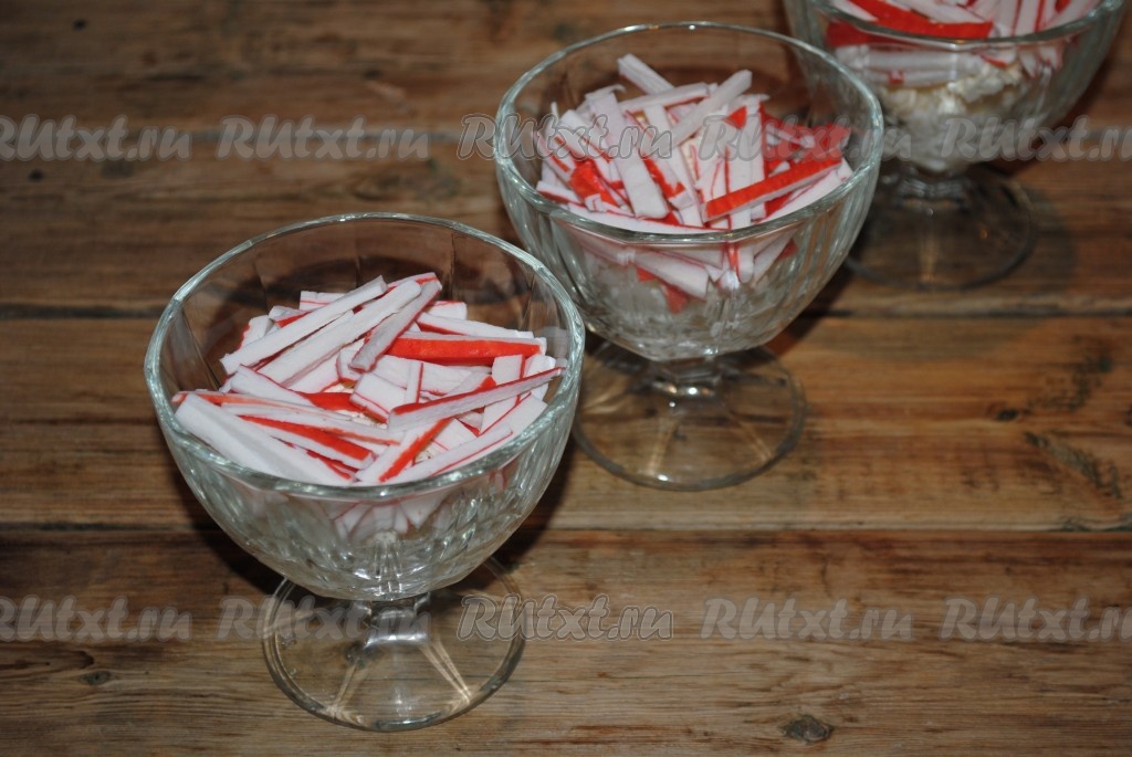 Следующим слоем выложить нарезанные соломкой крабовые палочки, слегка смазать майонезом.