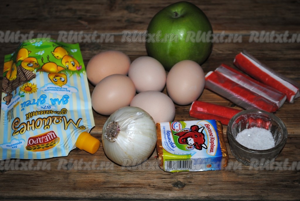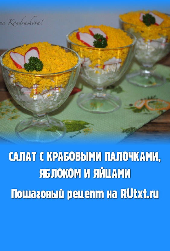 Украсить кружочками крабовых палочек и зеленью петрушки. Вкусный, нежный салат с крабовыми палочками, яблоком и яйцами отправить в холодильник на 1 час, чтобы он остыл и пропитался, и можно подавать на стол.