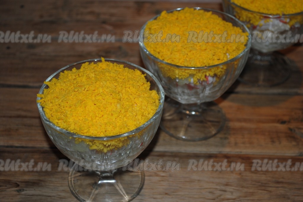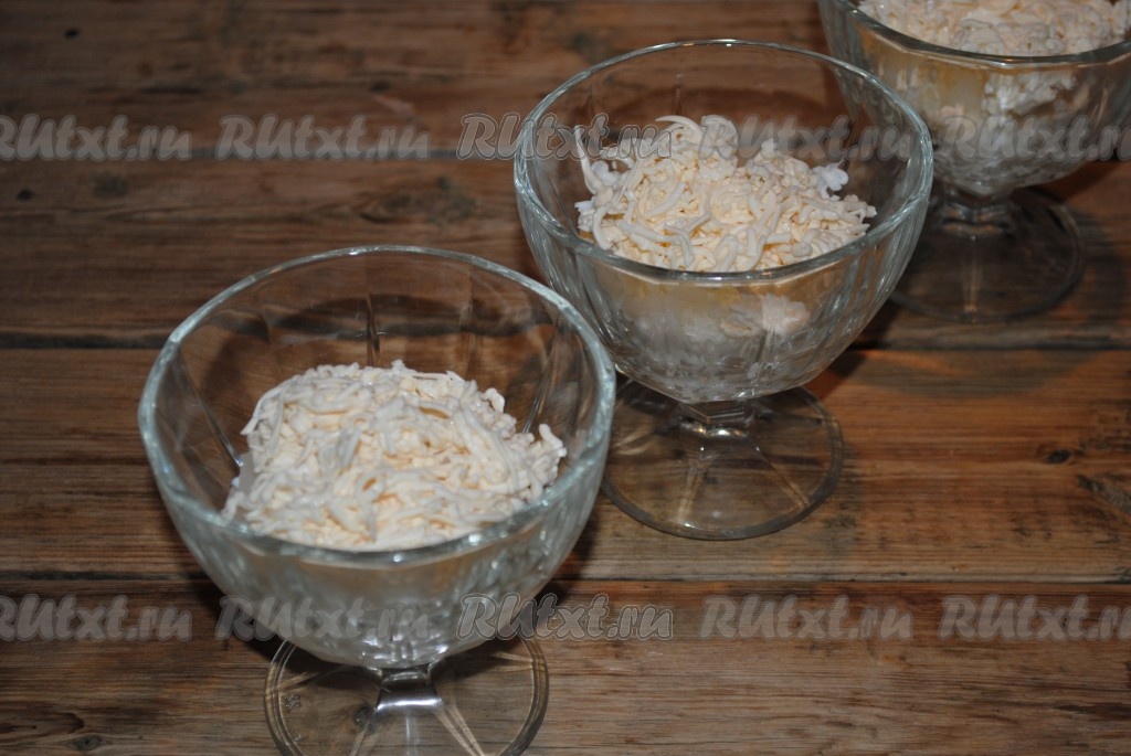 Яйца, сваренные вкрутую, очистить, разделить на белки и желтки. Белки, натерев на средней тёрке, выложить на дно креманки или салатницы.
