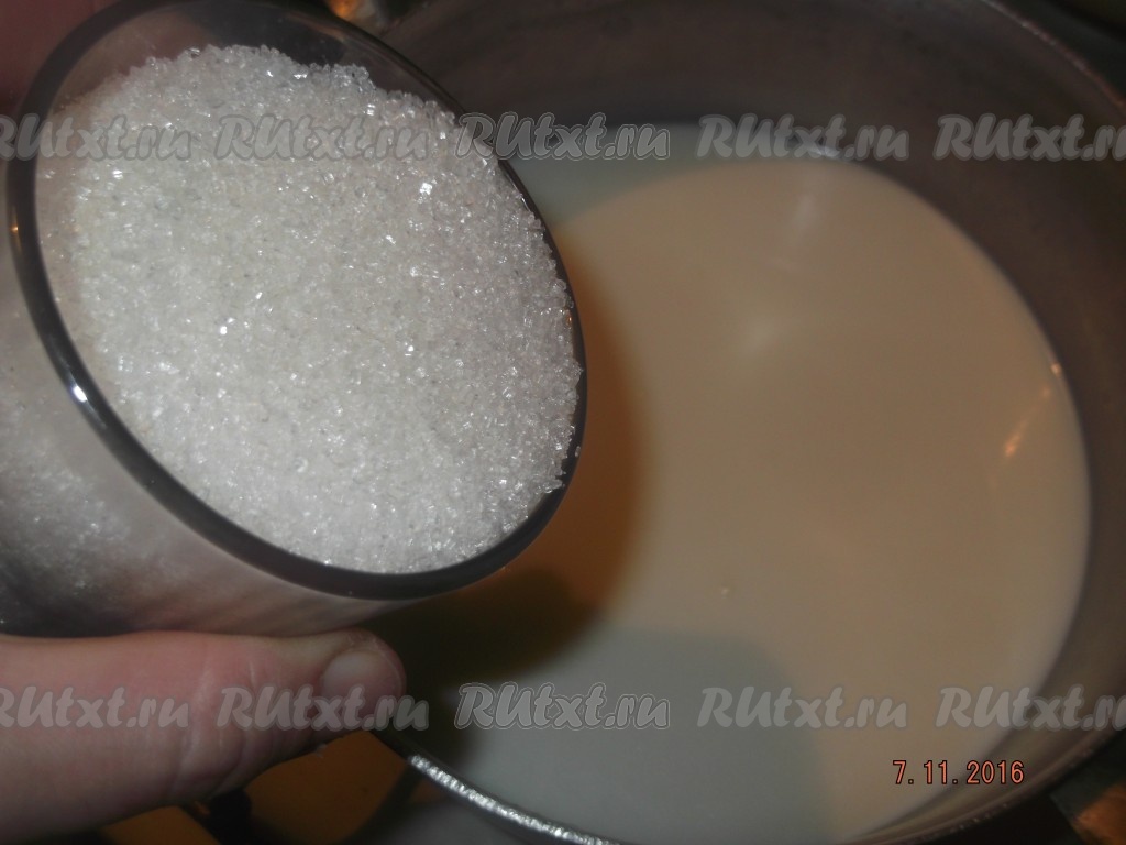 Когда молоко закипит, насыпаем сахар и ждем, пока еще раз закипит.