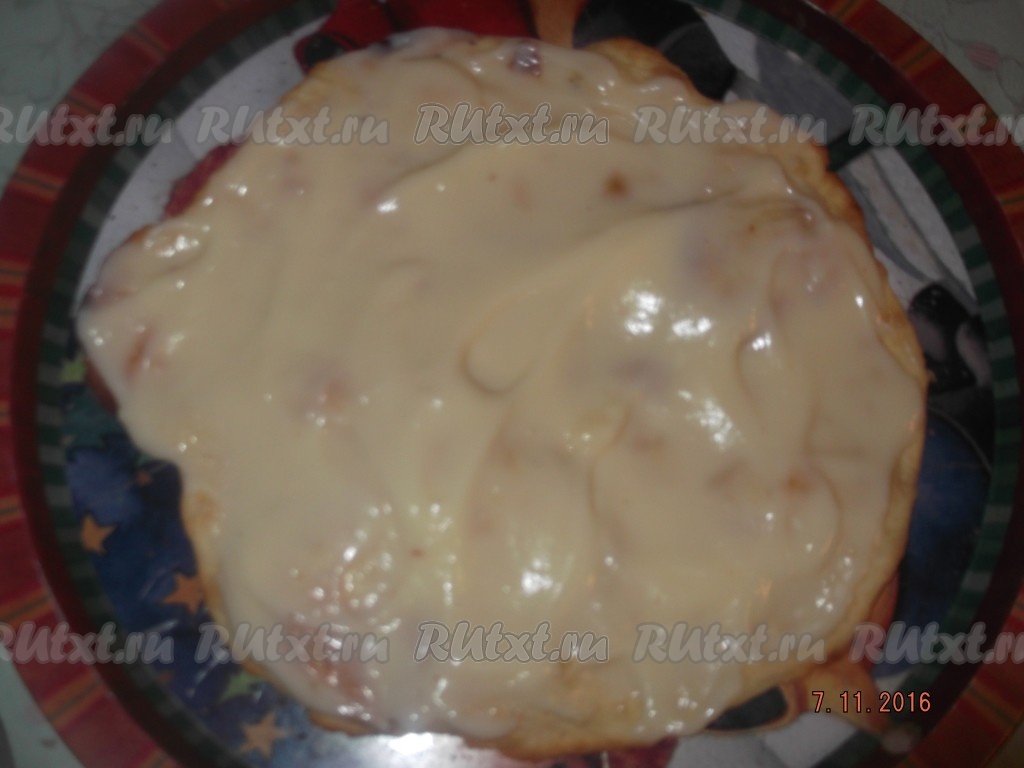 Выпекаем в разогретой духовке при температуре 180 градусов 5-7 минут, пока не подрумянится. Аналогично раскатываем и выпекаем остальные коржи. Когда все 9 коржей готовы, начинаем формировать торт "Наполеон". Берем один корж, сверху хорошо намазываем заварным кремом.