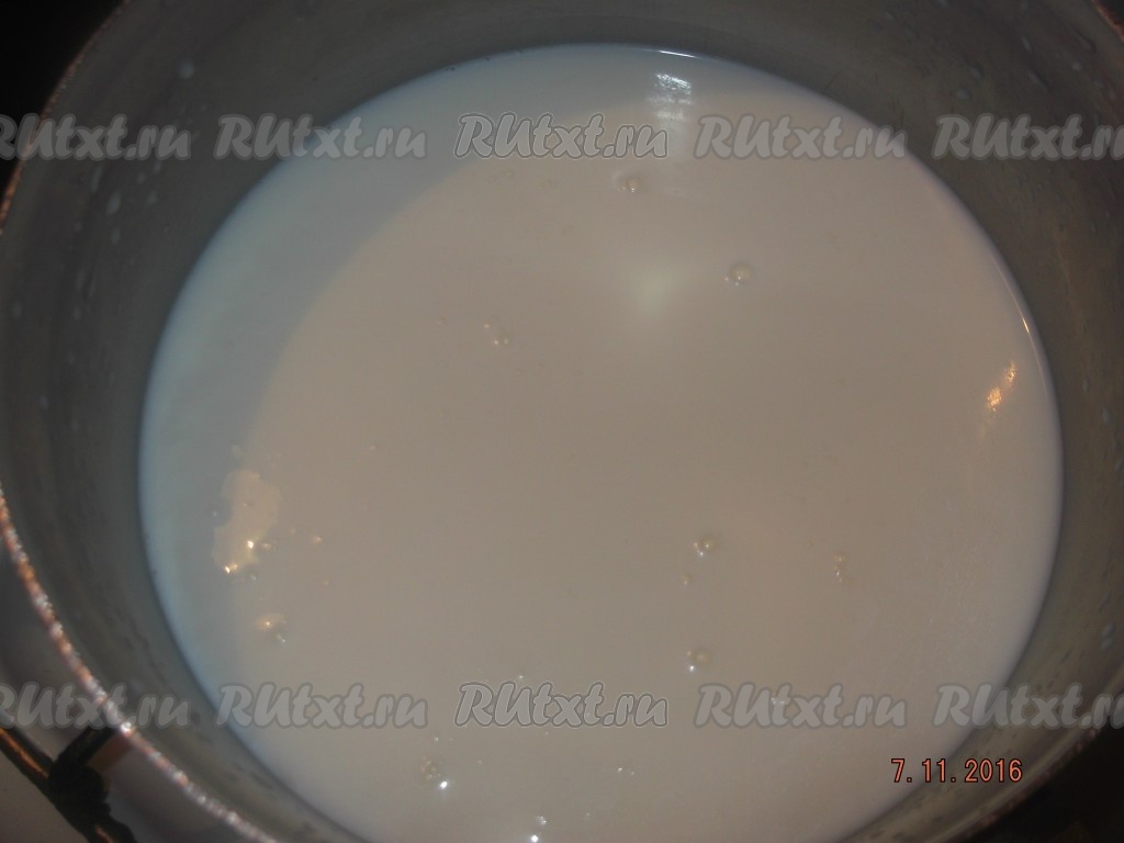 Пока наше тесто охлаждается, можно приступить к приготовлению заварного крема. Наливаем в кастрюлю молоко, ставим на огонь и доводим до кипения.