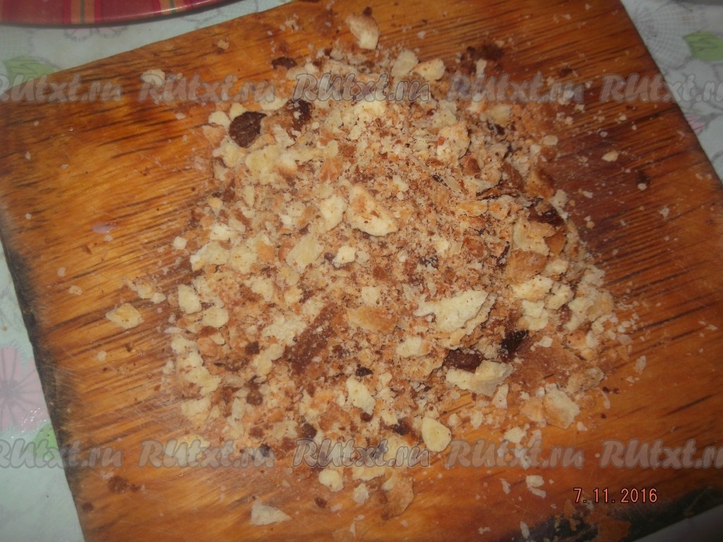 Сверху накрываем еще одним коржом, тоже смазываем кремом, и так складываем друг на друга все 8 коржей, смазывая кремом. 9 корж мы разминаем руками в крошку.