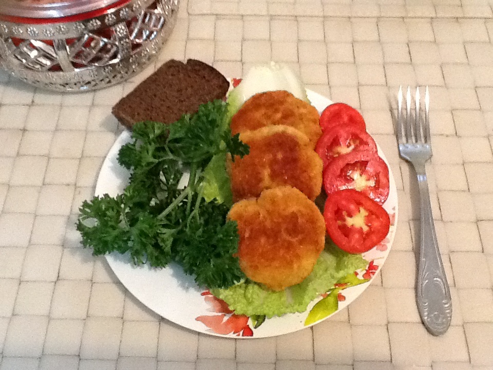 Подаем куриные оладьи горячими с овощами и зеленью.