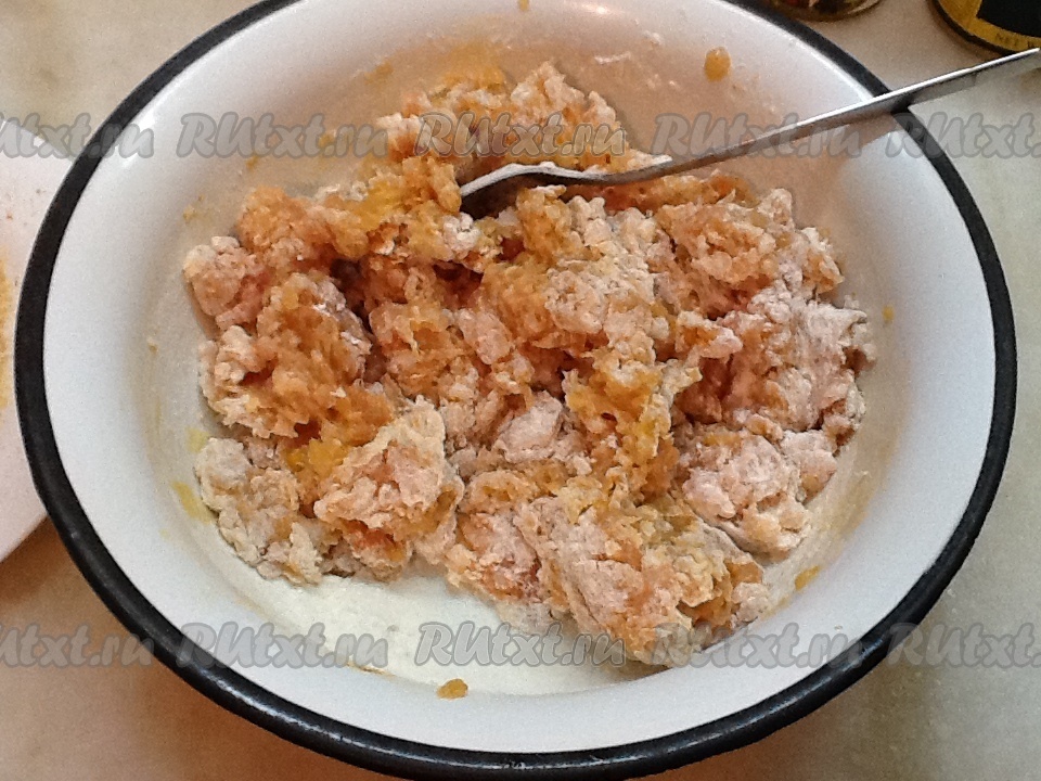 Добавить муку и еще раз перемешать до однородной массы.
