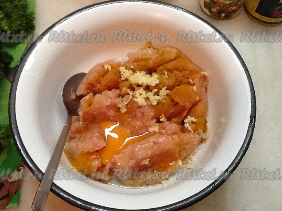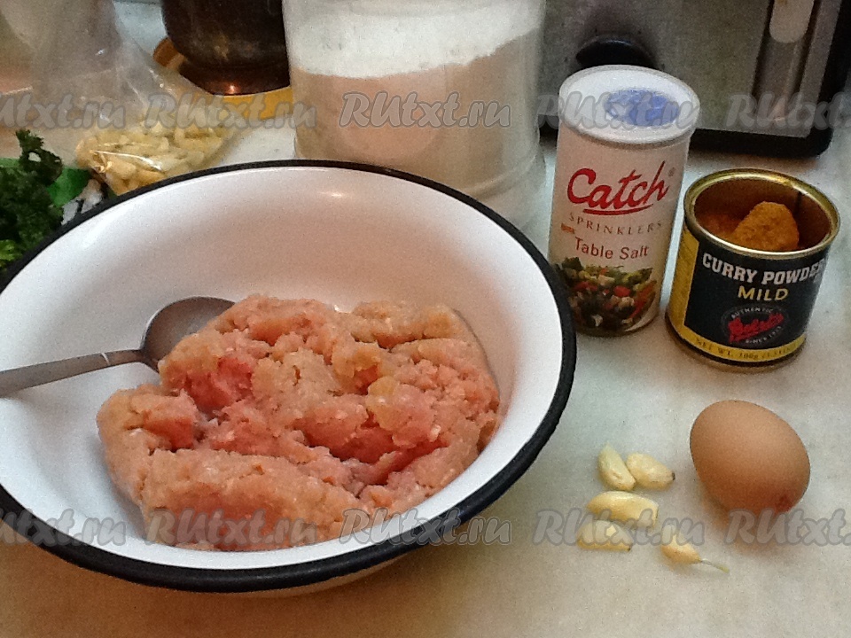 Смешать куриный фарш с яйцом, порошком карри, солью и чесноком, пропущенным через чеснокодавилку.