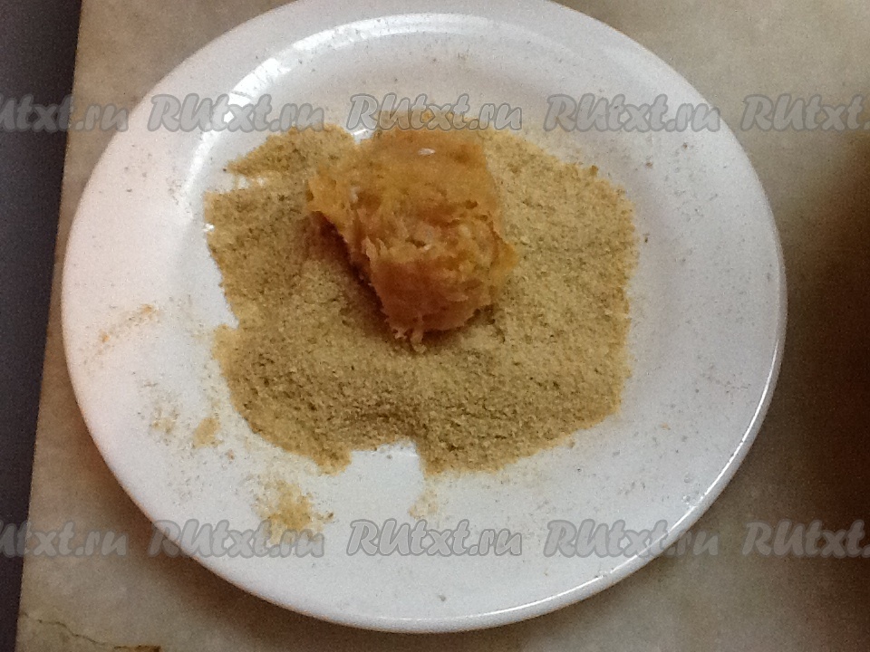 Насыпать панировочные сухари в тарелку и выкладывать фарш ложкой, обваливая затем в сухарях.