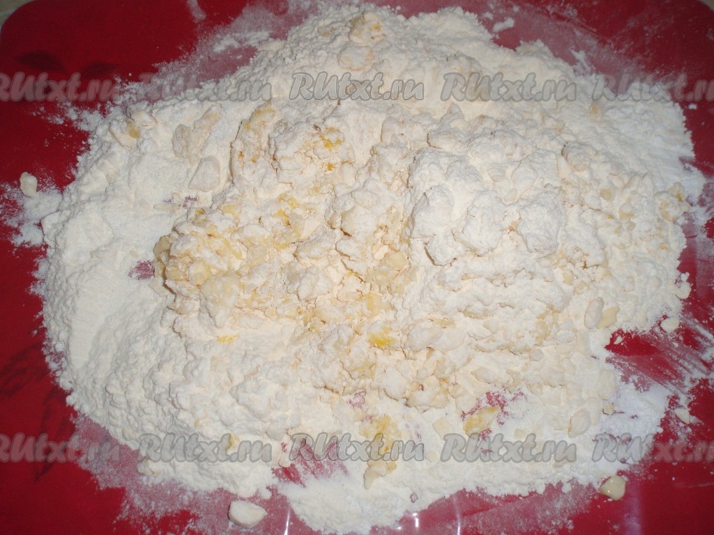 В муку всыпать сахар, добавить кусочки сливочного масла или маргарина и порубить ножом до образования крошки.