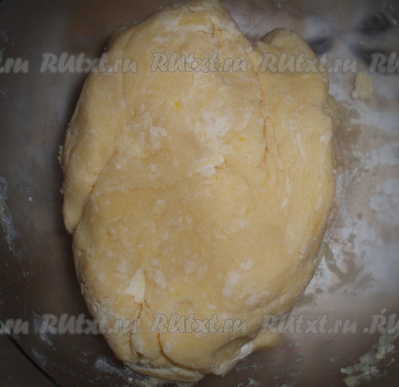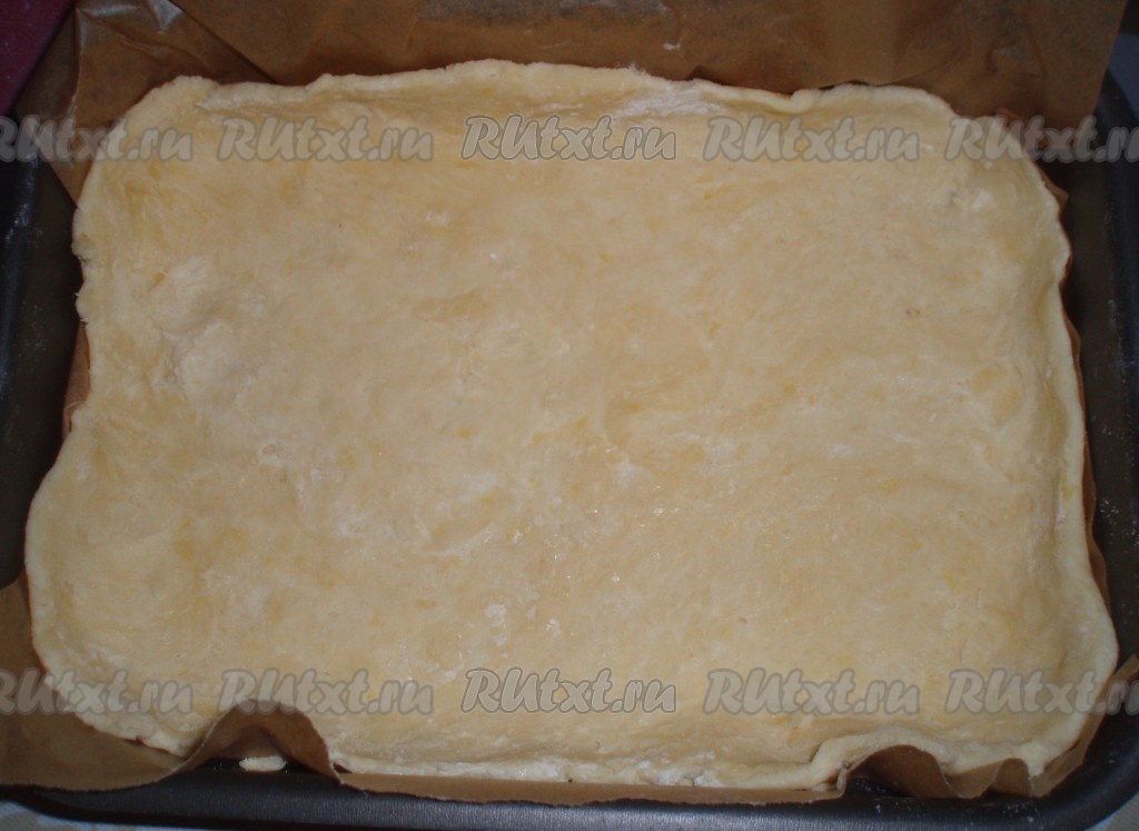 Охлажденное тесто вынуть из холодильника. 2/3 теста раскатать и выложить в форму для выпечки, формируя бортики (форму для выпечки можно застелить пергаментной бумагой).
