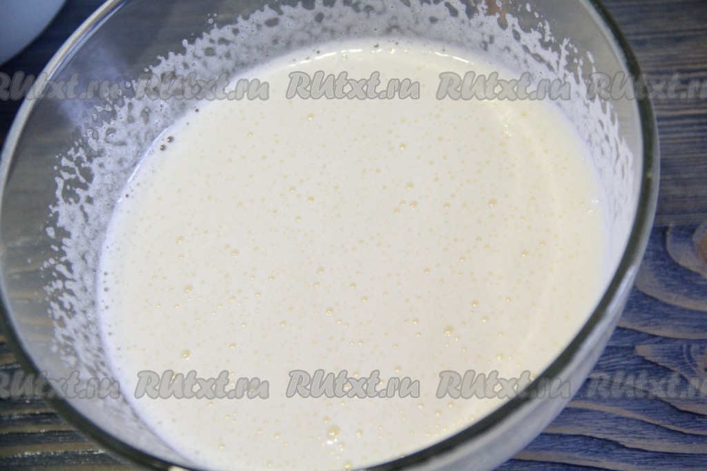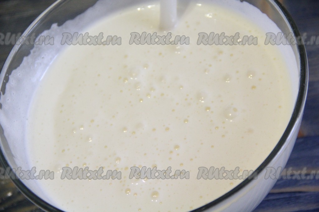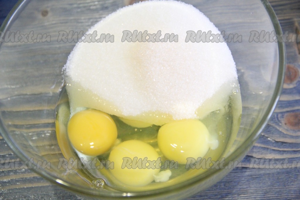 Взбить миксером яйца с сахаром в пышную массу.