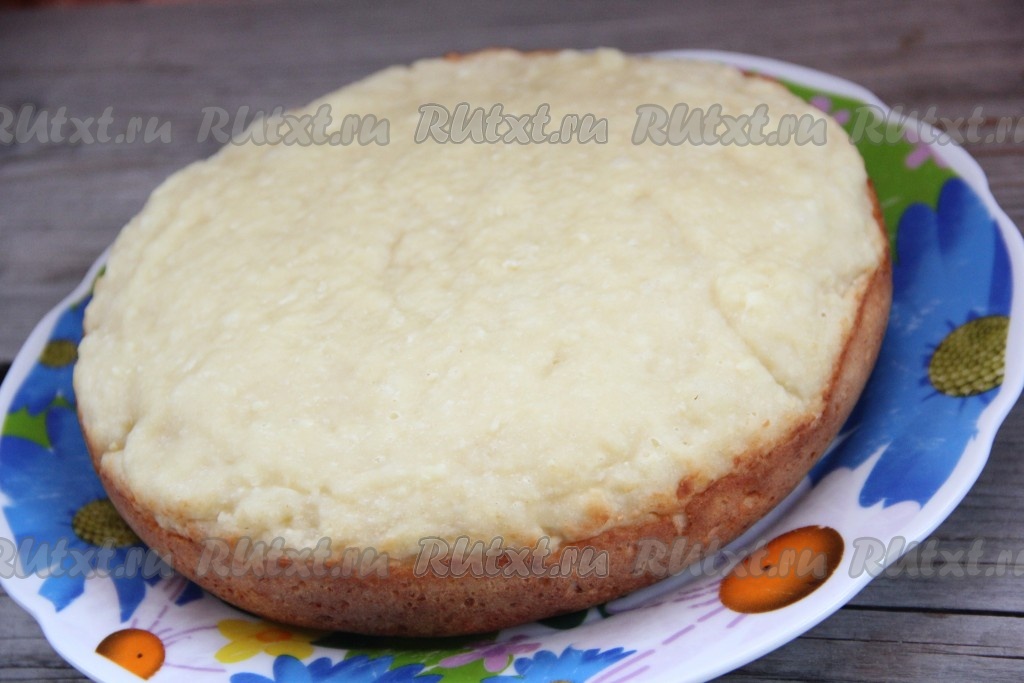 Готовый творожный пирог аккуратно переложить из чаши мультиварки на тарелку и слегка остудить.