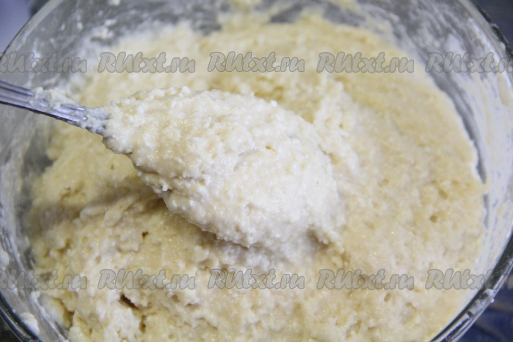 Тщательно перемешать тесто ложкой или силиконовой лопаткой. Тесто получится в меру густым и комковатым.