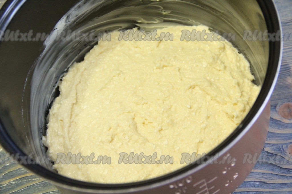 Чашу мультиварки смазать сливочным маслом. Выложить тесто в чашу. Выставить в мультиварке Redmond режим "Выпечка", готовить творожный пирог, примерно, 50-60 минут (готовность можно проверить сухой лучинкой).
