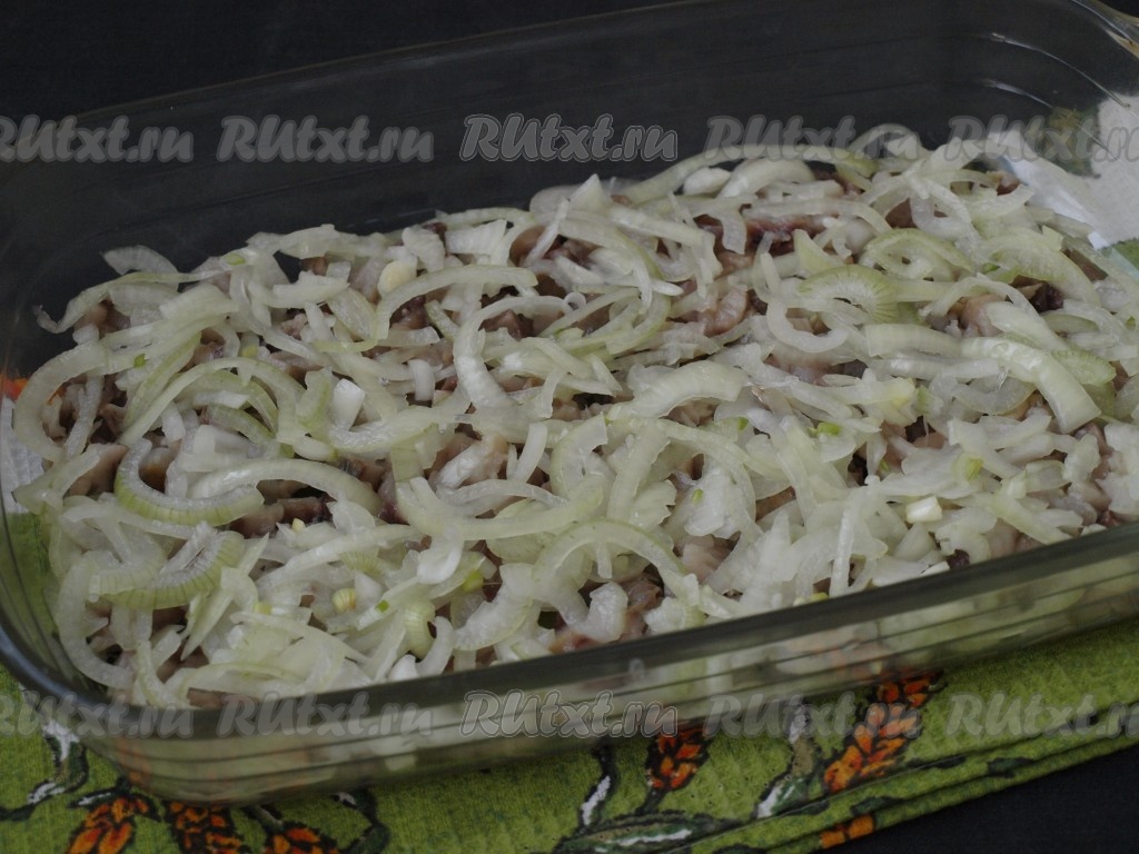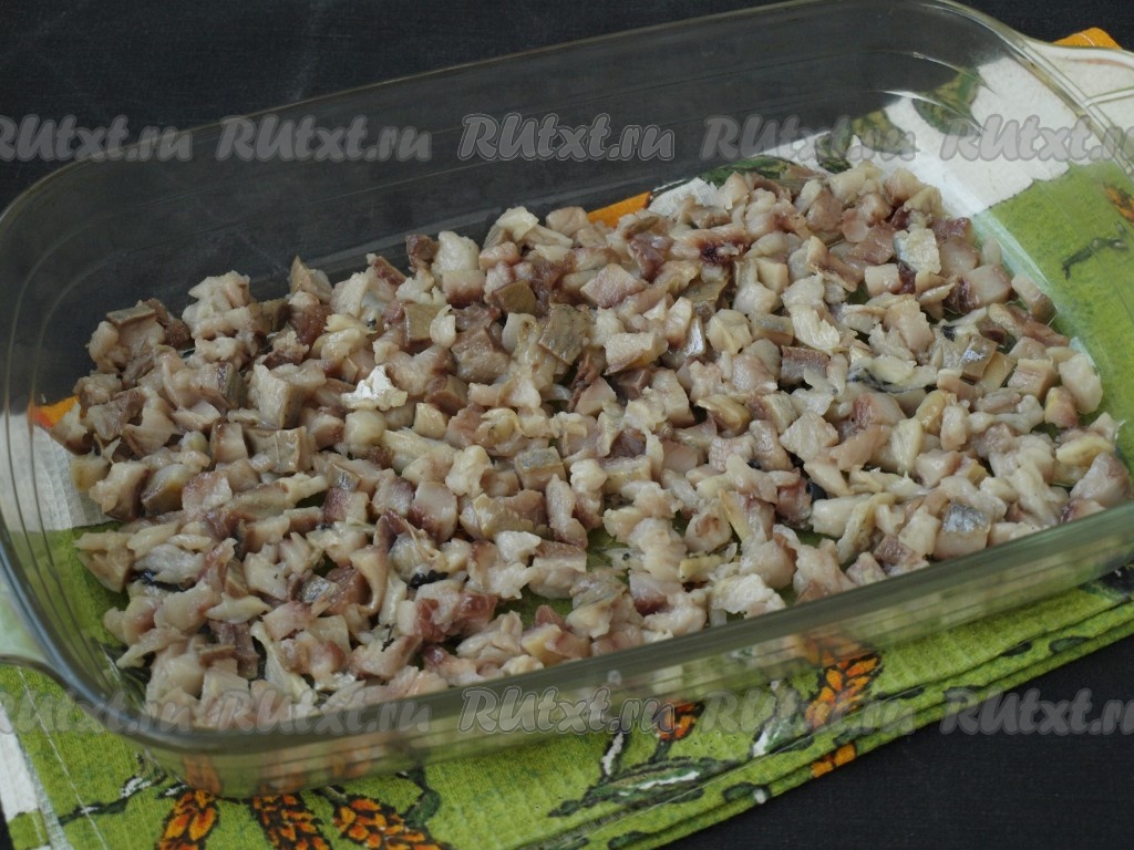 Сельдь очистить, удалить хребет, кости и внутренности, промыть водой обсушить. Филе сельди нарезать на небольшие кубики, выложить в подходящую форму первым слоем.