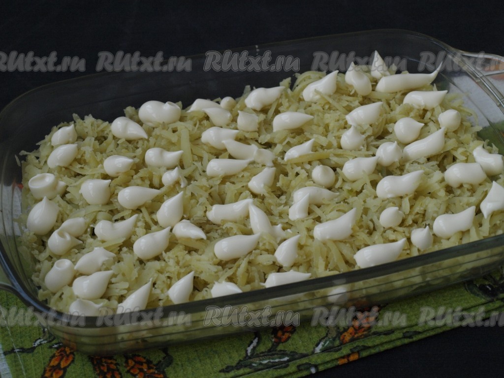 Поверх лука выложить очищенный варёный картофель, натёртый на крупной тёрке, немного посолить и смазать майонезом.