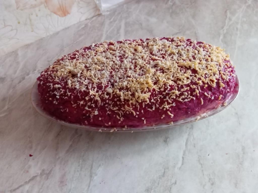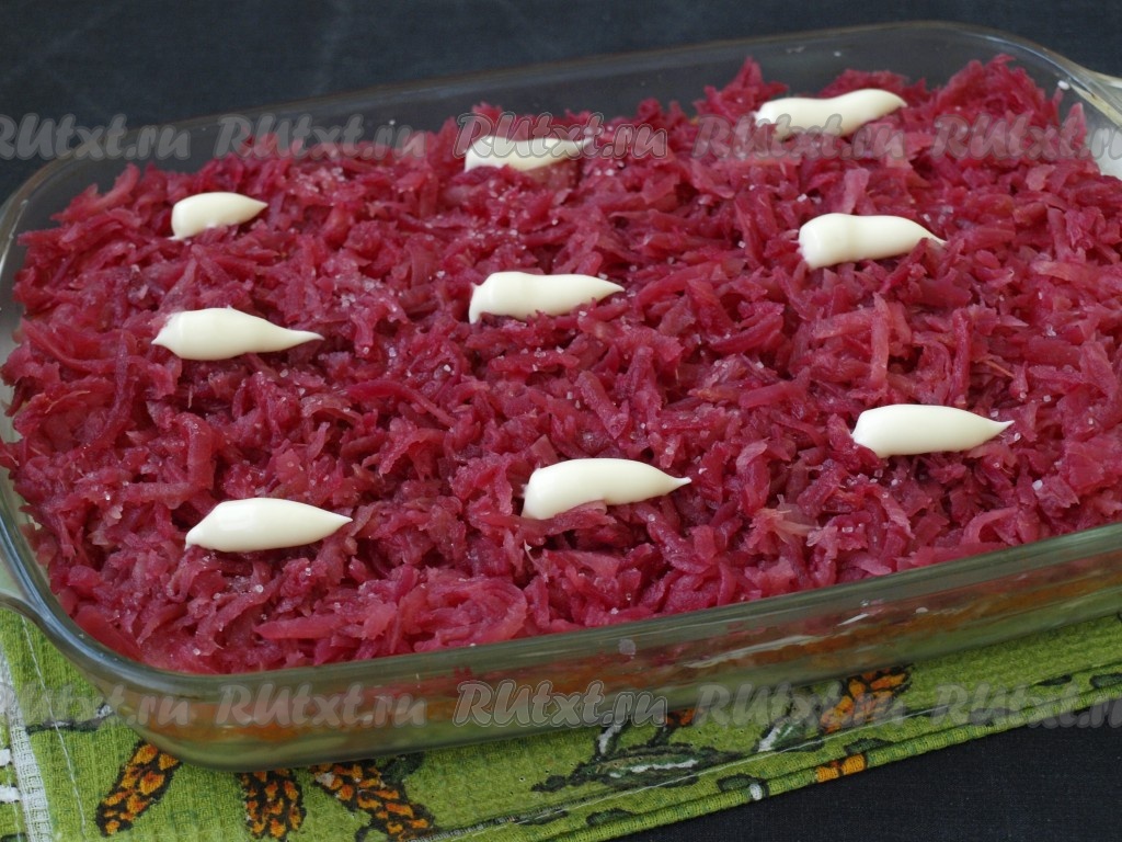 Последним слоем равномерно выложить очищенную варёную свеклу, натёртую на крупной тёрке, посолить и также смазать майонезом.