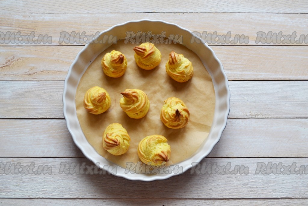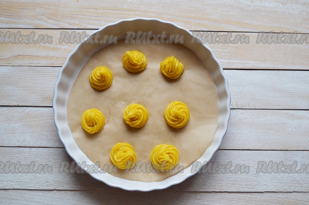 Выложить тесто в кондитерский шприц и отсадить пирожные на небольшом расстоянии друг от друга (на расстоянии, примерно, 1-2 см).