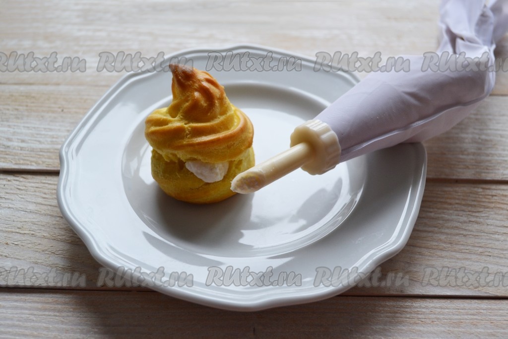 Наполнить кондитерский пакет с тонкой длинной насадкой творожным кремом и плотно наполнить каждый юмбрик.