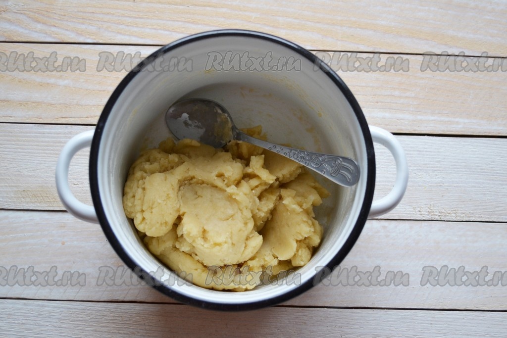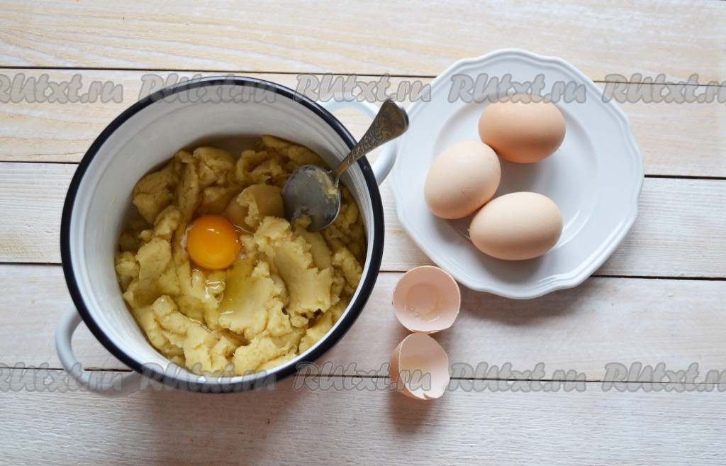 Снять кастрюлю с плиты. Когда тесто остынет до теплого, добавить одно яйцо и перемешать лопаткой тесто. Затем также поочередно добавить остальные яйца.