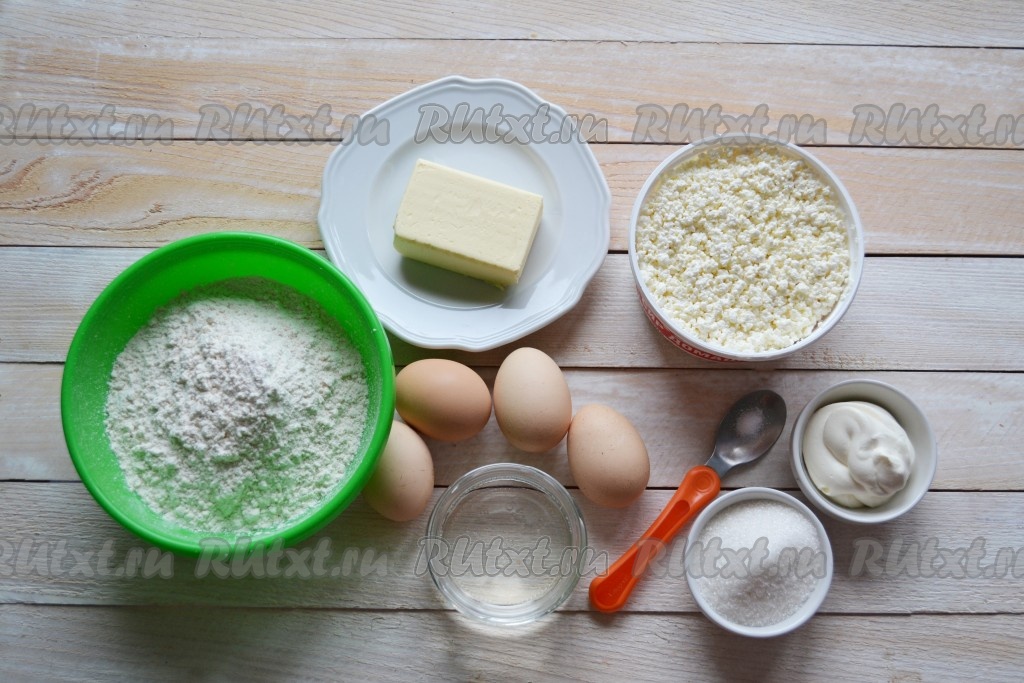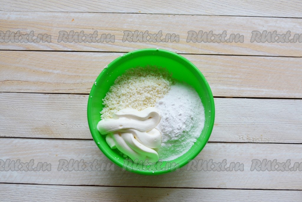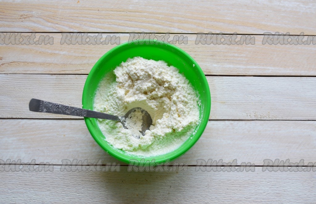 Всыпать к творогу сахарную пудру, ванилин и выложить сметану.