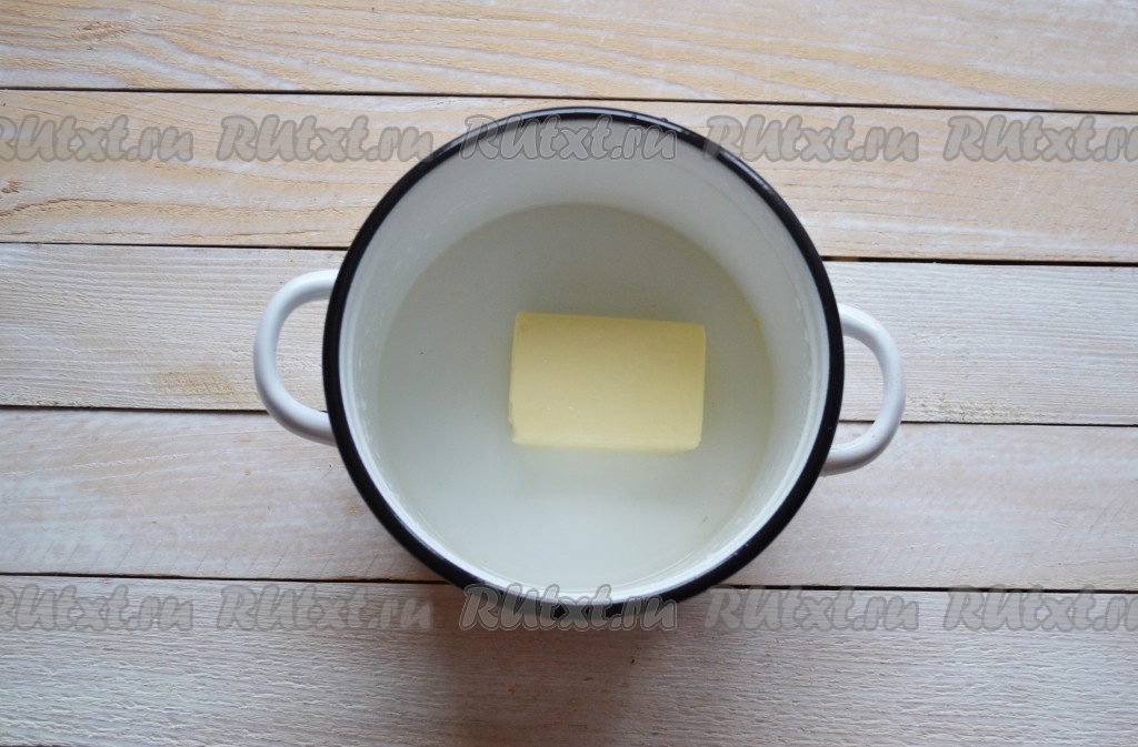 В кастрюлю влить воду и выложить масло. Поставить кастрюлю на слабый огонь и дождаться полного растворения сливочного масла. Всыпать щепотку соли.