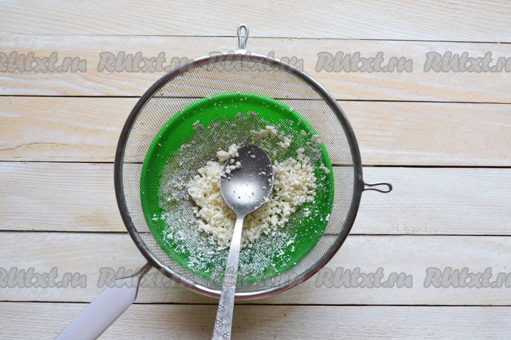 Пока юмбрики будут остывать, необходимо приготовить творожный крем. Через мелкое металлическое сито перетереть творог. Творог для начинки используйте пожирнее, а лучше всего - домашний.