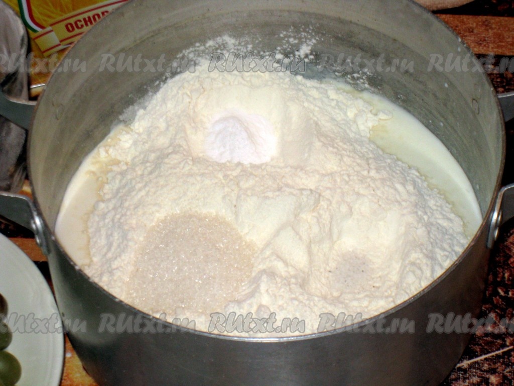 В кастрюльку (или миску) вылить кефир, высыпать муку, добавить сахар, соль и соду. Соду гасить не нужно, она погасится кефиром.