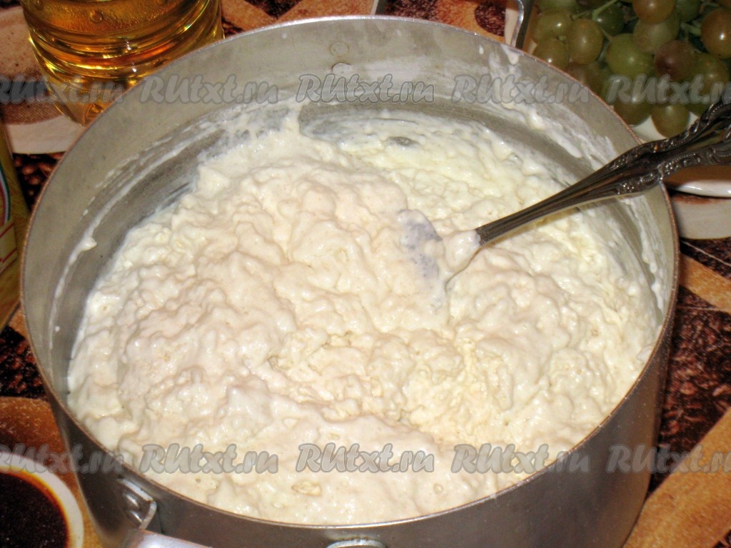 Быстро перемешать, не взбивая и не увлекаясь. Тесто для оладий на кефире получается густым и пышным.