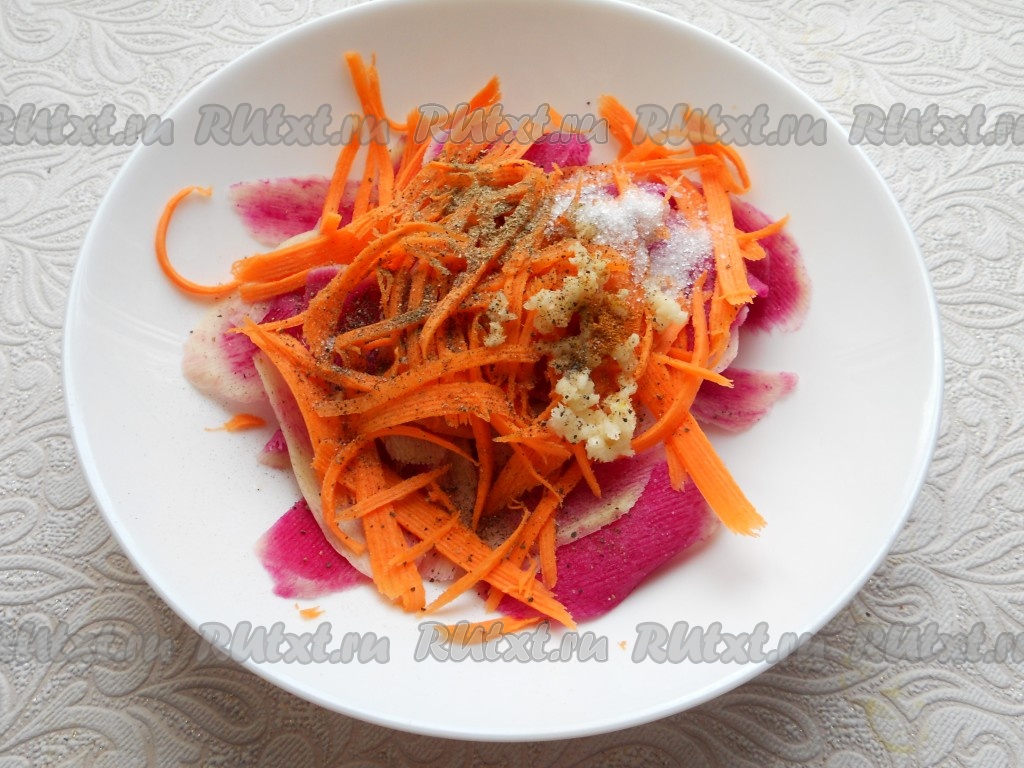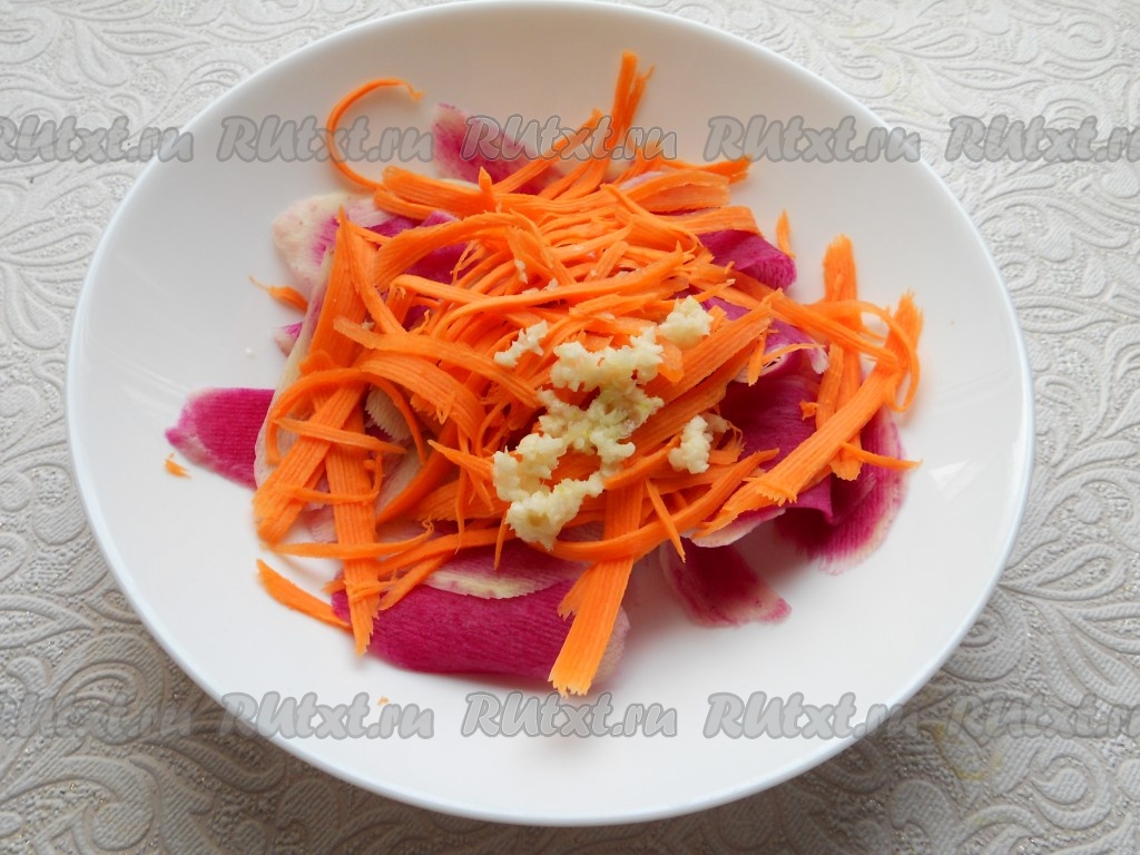 Добавить к редьке морковь, натертую на терке для корейской моркови, и пропущенный через пресс чеснок.