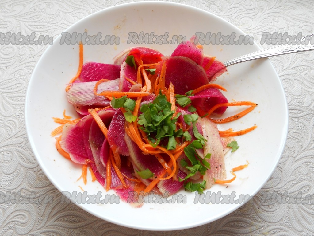 Выложить очень вкусный, интересный салат из редьки по-корейски в салатник или на тарелку горкой и подать к столу. Салат нужно готовить на один раз!